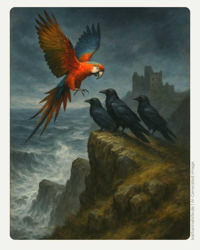Ein Rabe, der die Zukunft flüstert. Ein Papagei, der durch die Zeit reist.